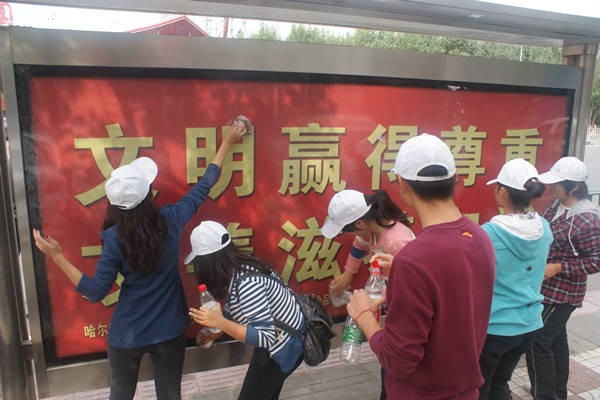 本次活动得到了学院的大力支持和同学们的积极响应。同学们积极报名参加本次志愿者服务活动,他们冒着初秋早晨的寒风早早来到集结地点,并带来了寝室的抹布、水桶等必需的劳动工具。在简单安排工作分工之后,志愿者服务队的队员们迅速对公交站牌进行集中清扫整洁,有条不紊地对公交站牌的各个角落进行清洁,重点对各类小广告进行去除和清洁。队员们积极的态度和高昂的热情感染了路边的行人,赢得了他们的一致好评,也使志愿者服务队在活动之余达到了宣传绿色环保理念的目的。经过1个小时的清洁,公交站牌逐渐褪去平日里的灰尘和广告,变得洁净如新。