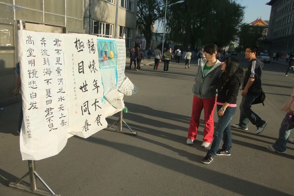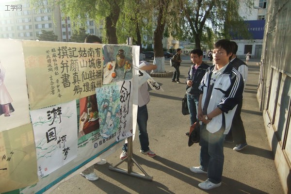本次比赛在本月12日启动,在大小美食广场进行宣传,通过向过往路人和公寓寝室发放传单的方式进行宣传,5月24日晚,获奖作品在大学生美食广场进行展板展示,吸引了众多观众的驻足观看。刘宇琦的书法《畅怀年大有,极目世同春》以其磅礴的气势,俊美的字体成为本次比赛最受观众喜欢的作品;周茜的书法《将进酒》笔法多变,大气轩昂,让人很难把作者和一个柔弱女生联系起来;蓝溪月的国画,孙露的人物画,苏梦瀛的静物画更是让人在欣赏艺术的同时,感到她们身上的才气勃发。