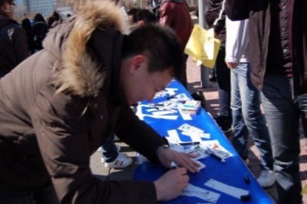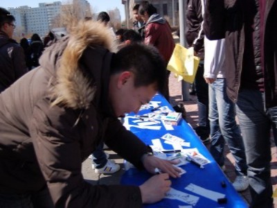 “节约用水”签字活动于11点30分在大学生美食广场前展开,志愿者向参与者介绍关于“节约用水”相关知识,并赠送小礼品。活动现场来往的同学都积极响应号召,主动在宣传条幅上签下了自己的名字。