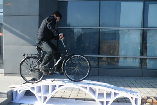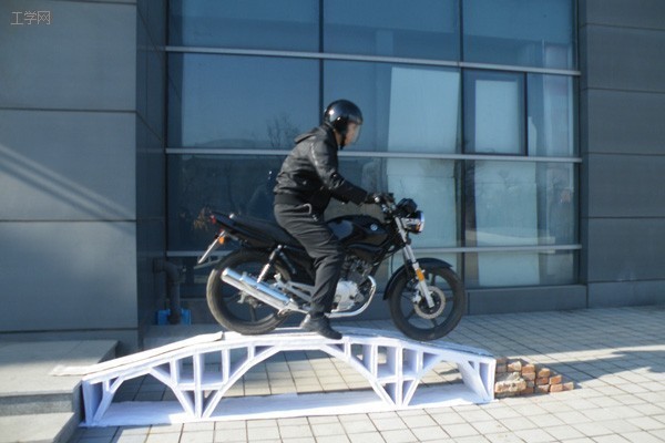 首先是表演桥的过人展示,9位同学同时站上纸桥并原地踏步5分钟之久,桥依然安然无恙。而他们609公斤的体重之和远远超过了理论计算出的桥300公斤的承重极限。随后是更赚人眼球的过车展示,83公斤的自行车、187公斤的摩托车都顺利从桥上通过。值得一提的是,张敏还亲自骑自行车从桥上通过,体验过桥时的感觉。