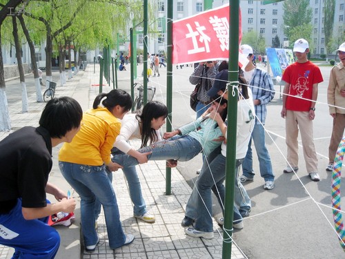 图为同学们做“过电网”和“两人三足”的心理小游戏,及相关教师为同学们做心理讲座。