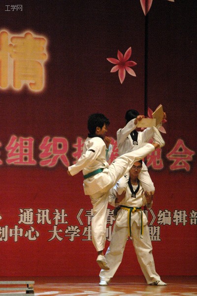 其中跆拳道表演中,跆拳道社别出心裁地请来了两个小跆拳道手一同表演,小朋友不俗的表现博得场下一片喝彩声。社团人员精湛的技艺则更加精彩。