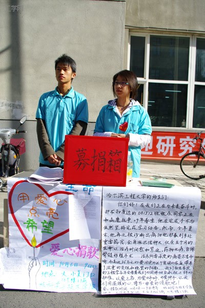 在活动过程中,我“核”你志愿者服务队在大学生美食城、美食广场、主楼、31号楼及各学生公寓门前设立捐款箱,并安排志愿者每天中午、晚上轮流值班,募集善款。为了让大家了解张永的情况,志愿者制作爱心捐款海报,在捐款现场设立展板,向全校师生发放倡议书。此外,志愿者服务队还将筹得的善款总额实时公开在宣传栏。