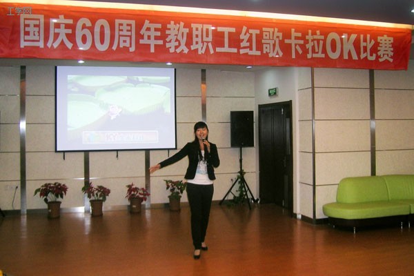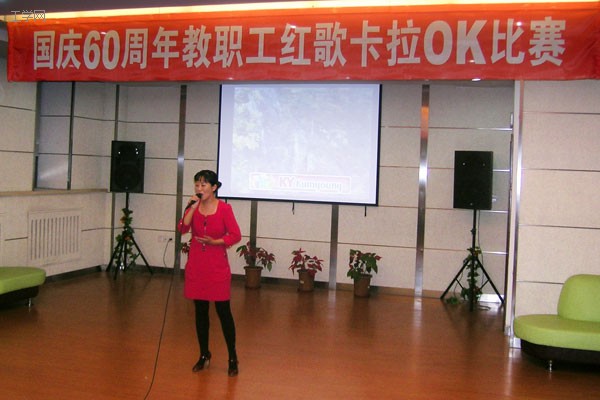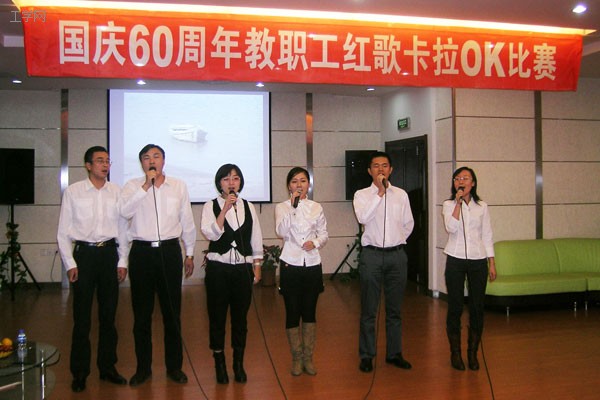 以庆祝建国60周年,回忆红色革命历程为主题的教职工卡拉OK比赛日前在启航KTV演艺中心举行。来自各单位工会的23名歌手演唱了《我的祖国》、《祖国你好》、《送给祖国妈妈的祝福》等红色经典歌曲。