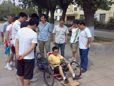 此外,在体训部、体育馆的支持下,参赛队伍明天将移至北体育馆开始为期近三周的正式训练,目前,作品采取主动轮后驱,方向轮为两个的结构方式,已经完成了动力及装载部分,作品外壳及车体正在紧张的制作中,预计月底最终成型。
