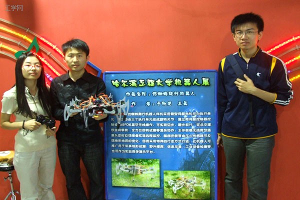 来自机电工程学院的“仿蜘蛛爬行机器人”代表我校参展,此作品由我校于欣龙、王晶两名同学自主设计并完成制作。机器人采用微型伺服电机作为执行单元,每足均由三个执行单元组成旋转关节,通过微伺服控制器控制或者经PC机蓝牙无线操作,可实现迈步、蹬步前行,定点支撑,铁丝网攀爬,全方位回转侦测等复杂动作。