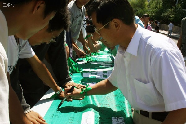 绿色的丝带牵起了师生的心,流淌在校园每个角落。路过的广大师生在工作人员的引导下,积极踊跃地系上了象征爱心传递的丝带,很多正在军训的新生也纷纷加入到互系爱心丝带的行列中来,满眼的绿色,舞动校园爱心的热浪。此外,“爱心传递和谐,师生欢度校庆”签名活动也同时进行,现场设立了绿色的长卷条幅,广大师生纷纷在长卷条幅上签名表达对母校的祝福。现场还布置了“爱心月”系列爱心、绿色、环保等主题的图片展板,并进行了校旗、团旗展示。校长刘志刚亲临活动现场进行签名,系上了象征爱心传递的“爱心丝带”并向工作人员致以问候,极大地鼓舞了负责签名和系爱心丝带的校学生会、水声学院、材化学院的青年志愿者们的热情。