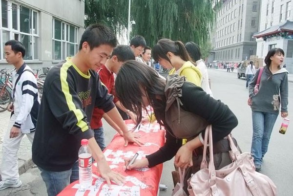 9月30日中午,机电工程学院求是学社在大学生美食城和大学生美食广场门前举办了题为“庆祝新中国成立六十周年”大型签名活动。