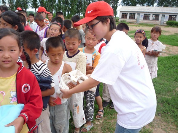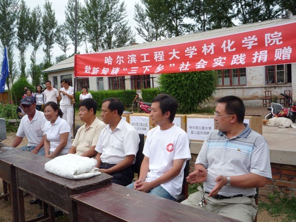 仪式开始前,玉泉小学校长发表讲话。他号召小学生们欢迎来自哈尔滨工程大学材化学院的同学老师们,并对各位大学生哥哥姐姐们的捐赠表示感谢。然后社会实践队向玉泉小学捐赠了衣服,书籍,电脑等物品。材化学院同学将东西一一发到各位小朋友手里,他们拿到物品都十分欣喜,纷纷翻阅与试穿。主任张金臣发表讲话。他指出这次三下乡实践活动具有极深远的意义。它锻炼了大学生们吃苦耐劳的能力,也希望此次捐赠能对玉泉小学的发展起到一定的帮助。
