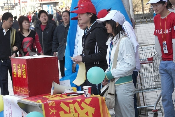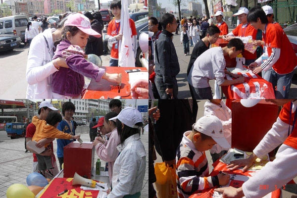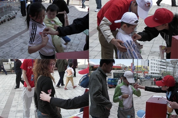 志愿者向每个捐款人贴上爱心铁,已表示对他们的感谢