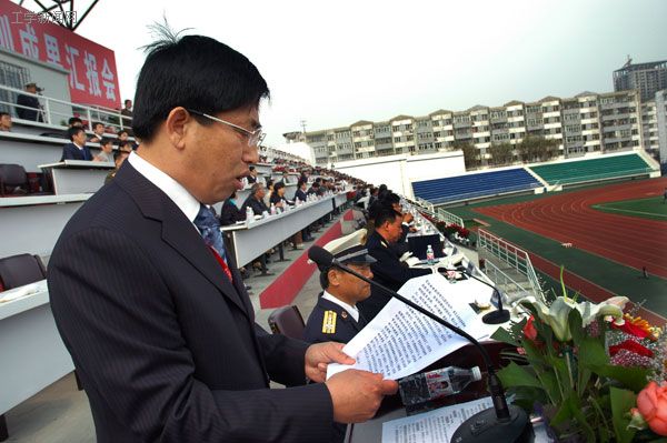党委书记王树权在汇报大会上讲话。他说,2006级本科生已圆满完成军训任务。同学们在军训中形成了团结协作、相互支持的集体精神,战胜自我、坚韧拼搏的顽强作风,服从大局、遵守纪律的优良品质,身心健康、能担大任的强健体魄。分列式充分展示了我校大学生良好的精神风貌。他希望全体同学能够将军训中的好思想、好作风、好习惯继续保持下去,把军训成果转化为学校进一步创建优良学风、校风的新动力和新源泉,牢固树立正确的人生观、世界观、价值观和社会主义的荣辱观,努力学习科学文化知识,坚持培养创新精神与实践能力,把自己锻炼和培养成为理想远大、信念坚定的人,追求真理、勇于创新的人,视野开阔、胸怀宽广的人,知行统一、诚实守信的人,德才兼备、全面发展的人,承担起历史赋予的庄严使命,为实现自己的人生价值和祖国的繁荣富强而努力奋斗。