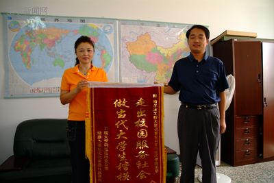 8月16日,燎原街道办事处文化家园社区党委书记张秀芝代表社区向我校赠送锦旗,以表示对我校青年志愿者进行的暑期社会实践活动的感谢。校团委书记陈凯云会见了客人并与他们进行了有关社会实践工作的交流。