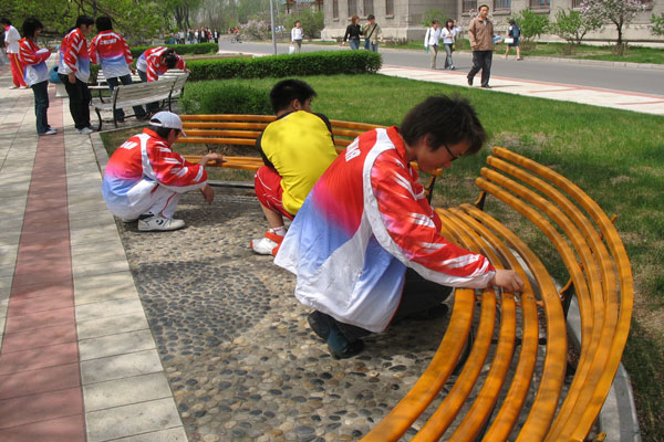 整个志愿服务活动的动员宣传大会在南操场举行.以经管院05级各班为单位,分别对我校一号主楼,各教学楼和图书馆周边绿地及长椅等公共设施进行了义务清洁,并对广大师生开展了迎评爱校宣传.活动中同学们表现积极,无畏脏累,认真圆满地完成了校园美化清洁工作,充分表现出我院青年志愿者们无私奉献,服务校园,积极迎评的精神面貌.