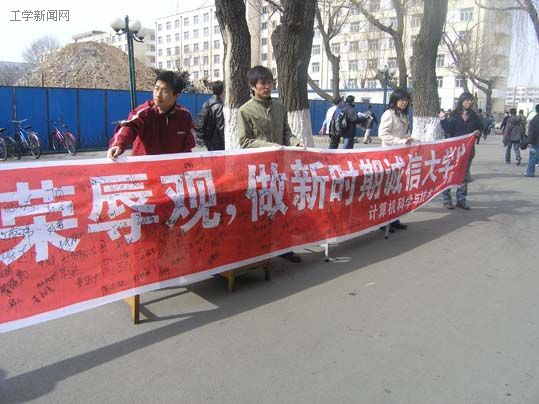 为倡导胡锦涛总书记提出的“八荣八耻”社会主义荣辱观,3月29日,计算机学院团委于美食广场门前举行了“学习‘八荣八耻’,树立社会主义荣辱观”大型签名活动,广大学生积极参与,踊跃签名。