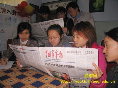 日前,我校大学生通讯社、《青春校园》杂志社的学生记者、学生编辑等学生干部组织集体阅读《中国青年报》、《中国教育报》的相关报道,学习胡总书记有关“八荣八耻”社会主义荣辱观的重要讲话。同学们均表示,要积极学习“八荣八耻”社会主义荣辱观重要讲话,从身边小事做起,养成良好的行为习惯,同时作为学生记者、学生编辑,应向更多的同学宣传社会主义荣辱观。
