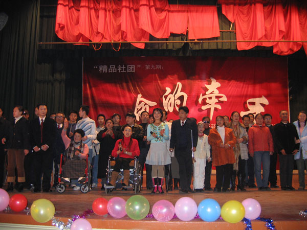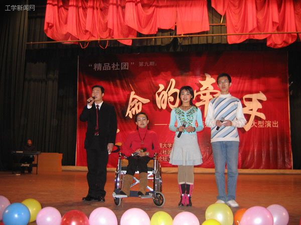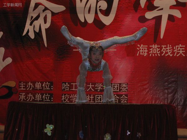 舞台上每一个节目,每一个人都是一个曲折而令人振奋的故事,尽管他们身体残疾,但他们却用一流的表演和动情的歌声展示着他们独特的才华,他们的自信和坚强让每一个亲耳聆听过他们故事的人无不为之动容。12岁——一个灿烂懵懂的年岁,但对于刘莹来说却是个不堪回首的岁月,因为在那一年一场意外让她永远只能与轮椅做伴,但坚强的她未曾屈服于命运的摆弄,勇敢的忍受着一次次痛苦和磨难,从未掉过一滴眼泪。今天在她27岁的生日的舞台上,面对如此多的关爱她的人,面对哈工程为她准备的精美生日礼物,当全场为她而高呼“生日快乐”时,她却深深的被感动了,她说这些真诚的关爱会更加坚定她生活的勇气。谁也未曾想到《软功》的表演者——张天娇竟是一位先天耳聋的小女孩。舞台上的杰出表演,舞台下稚气活泼给与我们的只有无言的祝福。还有唐佳琦这个刚来哈工程两个月的大一学子,儿时的一场不幸只留给了他一双手和腿,但他依然生活着,奋斗着。今夜他又坚强的站在了舞台上,伴随着一首《想说爱你不容易》,他单薄的身体随着歌声悠扬的摆动,那一刻的场景是绝妙的,正如歌声中所唱的“想说放弃你也不容易”,相信他从未放弃过,也永远不会放弃。