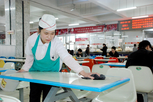 中午,记者来到美食广场看到了张玲玲。擦桌子、收餐具、拖地,每项工作她都做得一丝不苟。在她面前的仿佛不是食堂这个公共区域,而是自己的家,她要将家收拾得干干净净。等了很长时间,学生们用餐结束陆续离开后,我走上前和她聊了几句,问她为什么要跪着擦地呢?她说:“我的身体有些不方便,站在那里,有些地方够不着,跪下来就能把所有的地方都擦到。如果有些地方擦不干净,我心里总是觉得不安。”我问她知道自己成了微博“名人”的事么,她不好意思地说:“听别人说起过,真的很感谢学生们的体谅和关心,这都是我该做的”。当被问及是否喜欢自己的工作时,她回答说:“这份工作让我可以自食其力养活自己,也可以补贴家用,领导、同事们对我都很好,工作挺开心。”