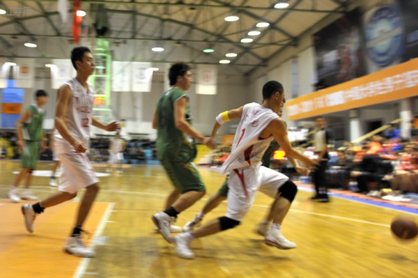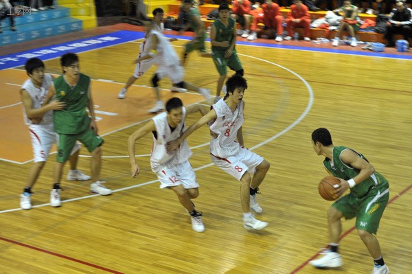 辽大在哈工程的严密防守下进攻受阻,在外场倒手传球