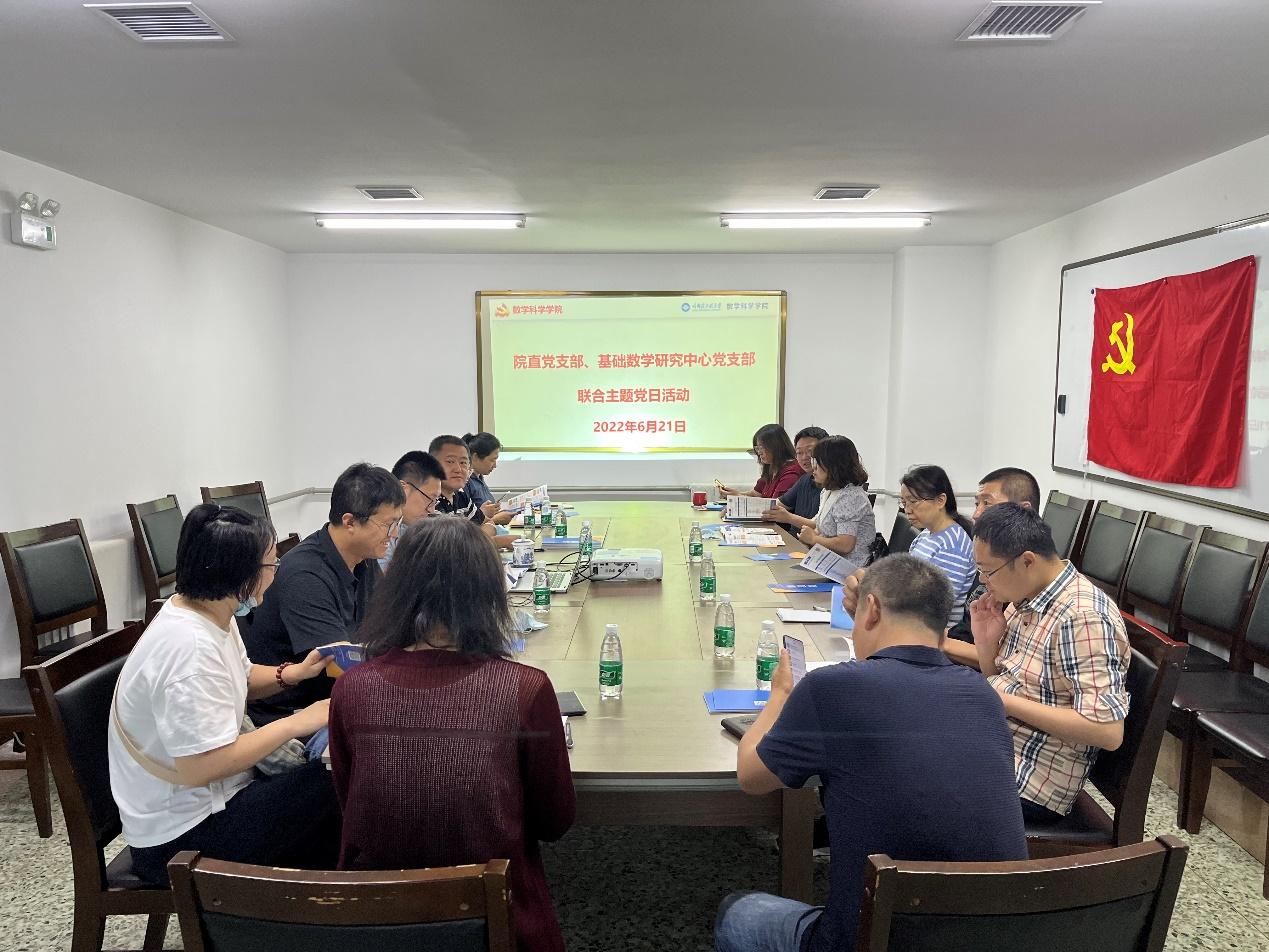 6月21日,数学科学学院院直党支部、基础数学研究中心党支部10余名教师党员开展联合主题党日活动,学院党委书记王锐、副院长张世彤参会,会议由院直党支部书记刘东平主持。