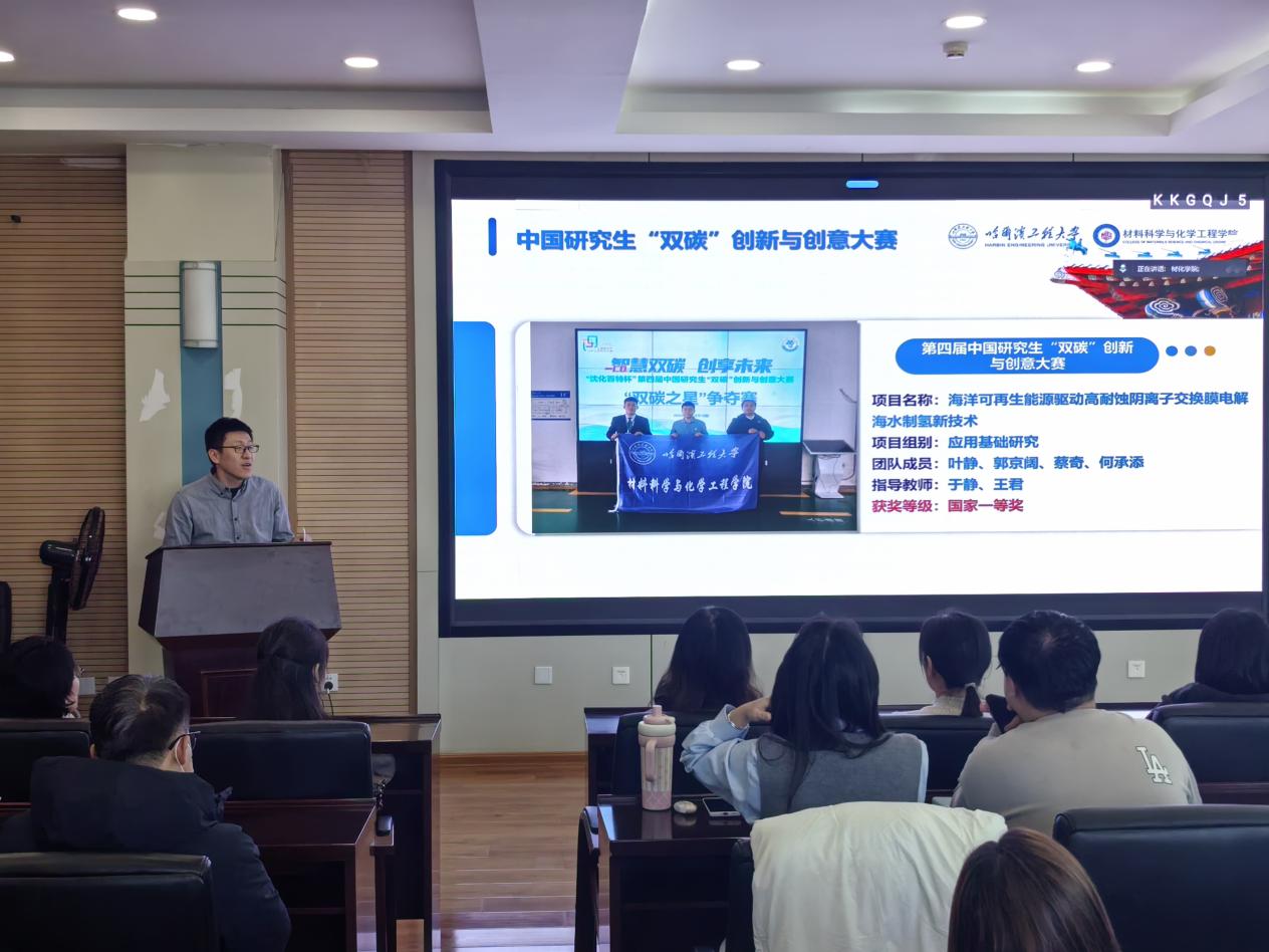 会议经验分享环节,材化学院2023级博士研究生赵光达作为学校首个国创赛产业赛道金奖团队代表,从国创赛参赛要求、赛程安排和材料打磨等角度分享了国创赛的参赛经历与感悟。材化学院2024级硕士研究生张欣作为学校首个研究生“双碳”大赛全国冠军,着重从呈现细节入手,讲解PPT制作逻辑以及如何让项目的政策背景和核心技术贴合研究生“双碳”大赛的设计要求。现场互动积极,气氛热烈。