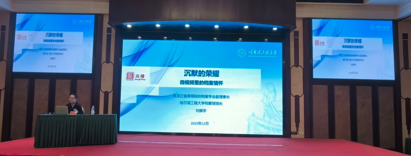学校档案馆馆长刘振宇代表黑龙江省高等院校档案学会作了题为《沉默的荣耀——微视频里的档案情怀》典型发言,他从“档案资源的精神旨归”“龙高档学会基本情况”“微视频大赛创办历程”“微视频大赛精彩纷呈”“微视频大赛工作设想”五个方面,详细介绍了龙高档学会创办微视频大赛的意义、历程、作用及文化辐射价值。分享了哈尔滨工程大学档案馆立足存史资政育人功能,深入挖掘红色校史资源,参加省委组织部“党课开讲啦”党课大赛、新华社《情拥尔滨》宣传片报道等相关情况。