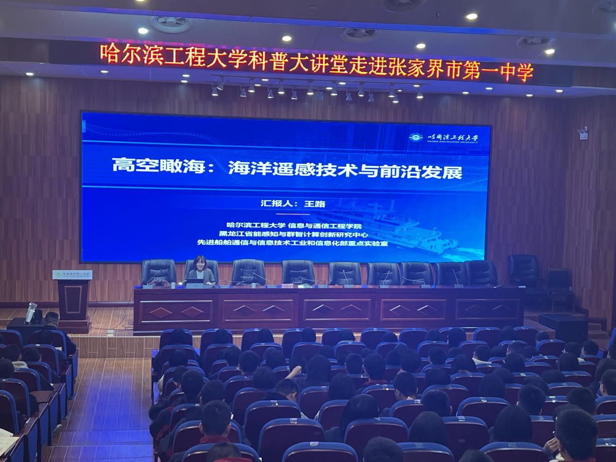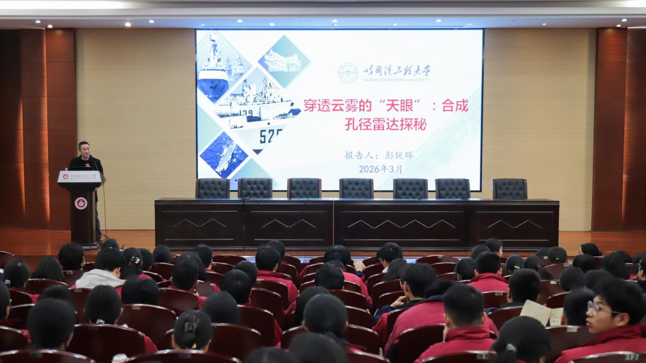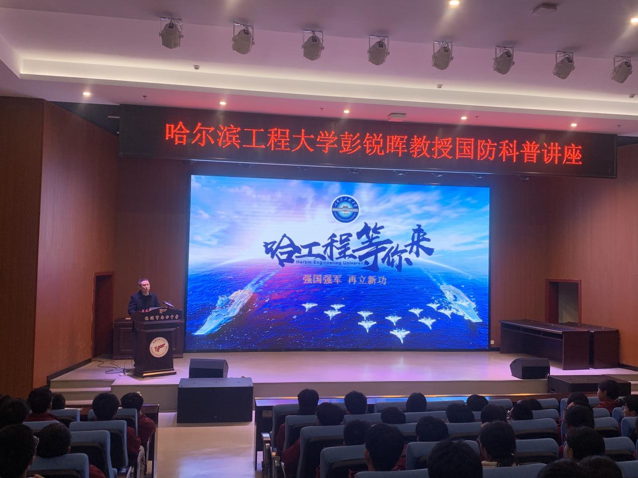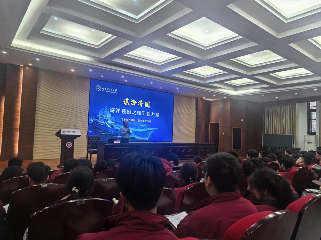 在汉寿一中,赵春晖教授以哈尔滨工程大学的历史文化为主题,讲述了学校从“哈军工”到“哈船院”再到“哈工程”的辉煌办学历程,介绍了学校在服务国家“三海一核”(船舶工业、海军装备、海洋开发、核能应用)战略中的突出贡献。