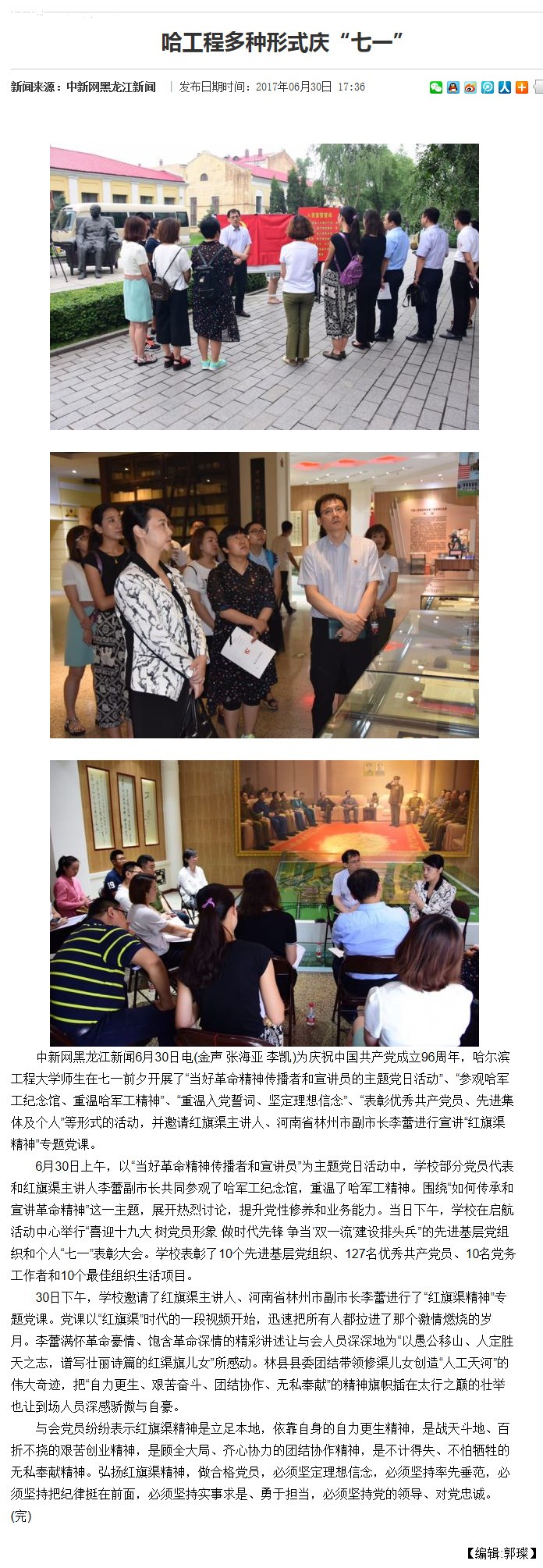 为庆祝中国共产党成立96周年,我校在七一前夕开展了“当好革命精神传播者和宣讲员的主题党日活动”、“参观哈军工纪念馆、重温哈军工精神”、“重温入党誓词、坚定理想信念”、“表彰优秀共产党员、先进集体及个人”等多种形式的活动。其中邀请红旗渠主讲人、河南省林州市副市长李蕾宣讲“红旗渠精神”专题党课活动受到媒体关注,《中国教育报》、中新社、黑龙江电视台《新闻联播》等多家媒体进行了报道。