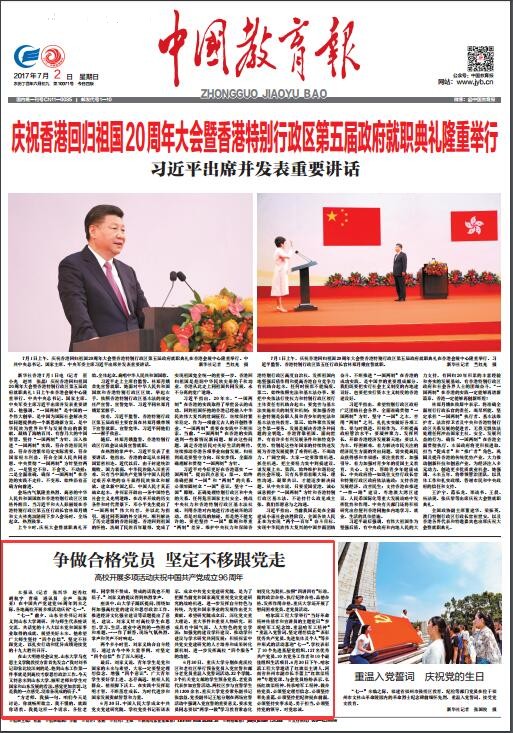 7月2日,《中国教育报》头版以“争做合格党员 坚定不移跟党走”为专题报道了我校庆七一特色活动。