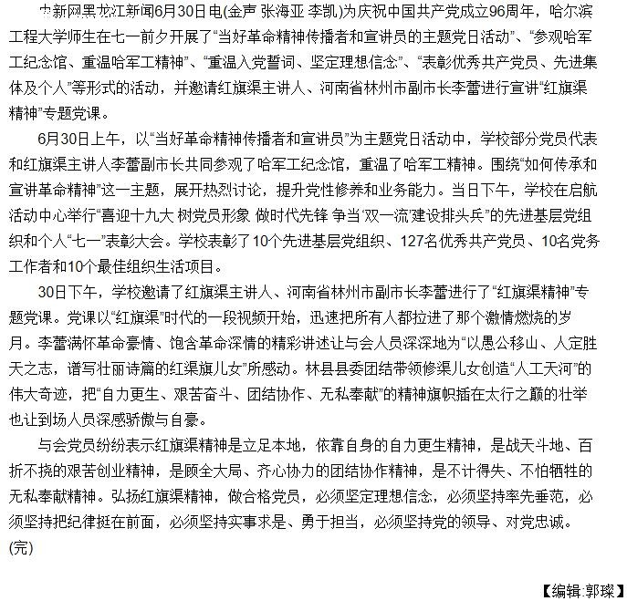 哈尔滨工程大学举行“当好革命精神传播者和宣讲员的主题党日”“参观哈军工纪念馆、重温哈军工精神”“重温入党誓词、坚定理想信念”“表彰优秀共产党员、先进集体及个人”等多种形式的活动喜迎“七一”,学校表彰了10个先进基层党组织、127名优秀共产党员、10名党务工作者和10个最佳组织生活项目。6月30日下午,哈尔滨工程大学邀请了红旗渠主讲人、河南省林州市副市长李蕾上“红旗渠精神”专题党课。与会党员纷纷表示,弘扬红旗渠精神,传承哈军工精神,做合格党员,必须坚定理想信念,必须坚持率先垂范,必须坚持把纪律挺在前面,必须坚持实事求是、勇于担当,必须坚持党的领导、对党忠诚。