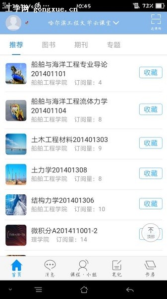 有了“云课堂”师生再不必为借不到馆藏纸质图书而烦恼了,只要登录哈尔滨工程大学“云课堂”掌上教参资源平台,课程所需的各种教参资源一览无余,且不受时间、空间的限制,让你体验到“一云在手,资源不愁”的学习快感;如果你想要学习某个专业方面的知识却苦于不知道选择哪种教学资料,“云课堂”中可以直接选择对应的专业进行大类检索,直接推送给你学校老师所推荐的教参资料;在平台中,师生还可以任意组建交流研讨小组,轻松分享资源,协同学习,解决了师生课下学习活动的交流需求。