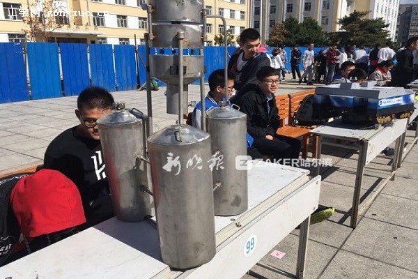 这边快船比赛玩得热闹,那边一辆带着护甲的战车吸引了很多孩子的目光,自动化学院的这辆"Robomasters战车"是去年哈工程创梦之翼站队参加全国大学生机器人大赛全国总决赛的获奖作品。"你看这个机器人四周带有护甲,顶部有个炮台,当时比赛采用的是现场对抗的方式。战车会发射炮弹进行对抗,属于军事用途的机器人。去年全国比赛北方赛区一等奖,全国决赛三等奖。"