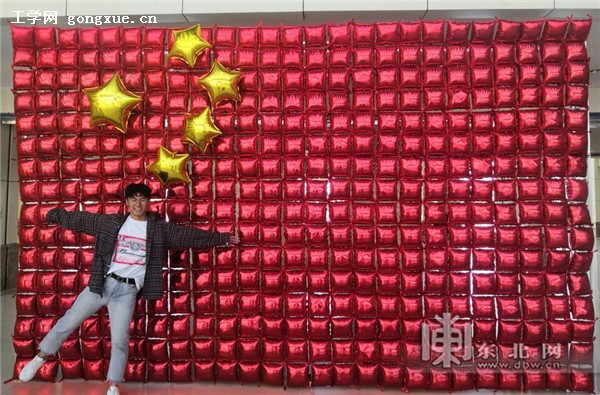 学生与铝箔纸气球串联成的国旗合影。图片由哈尔滨石油学院提供。