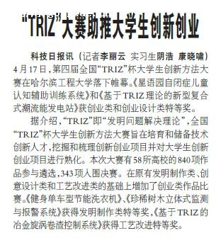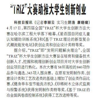 科技日报讯 (记者李丽云 实习生阴浩 康晓啸)4月17日,第四届全国“TRIZ”杯大学生创新方法大赛在哈尔滨工程大学落下帷幕。《星语园自闭症儿童认知辅助训练系统》和《基于TRIZ理论的新型复合式潮流能发电站》获创业类和创业设计类特等奖。