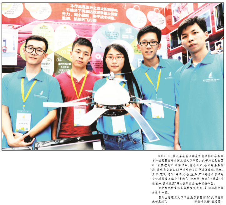 8月10日,第八届全国大学生节能减排社会实践与科技竞赛在哈尔滨工程大学举行。大赛共收到全国281所高校的2534件作品,经过网评、会评等层层筛选,最终来自全国68所高校的161件涉及能源、机械、资源、建筑、电气、海洋、社会、经济、矿业等多个领域的节能减排作品集中“亮相”。大赛将“角逐”出最具“节能减排、绿色能源”理念的科技或社会实践作品。