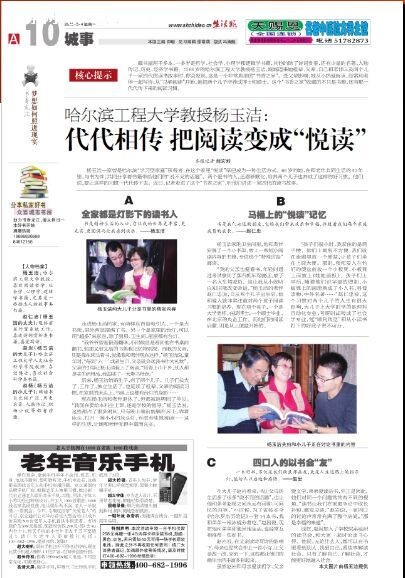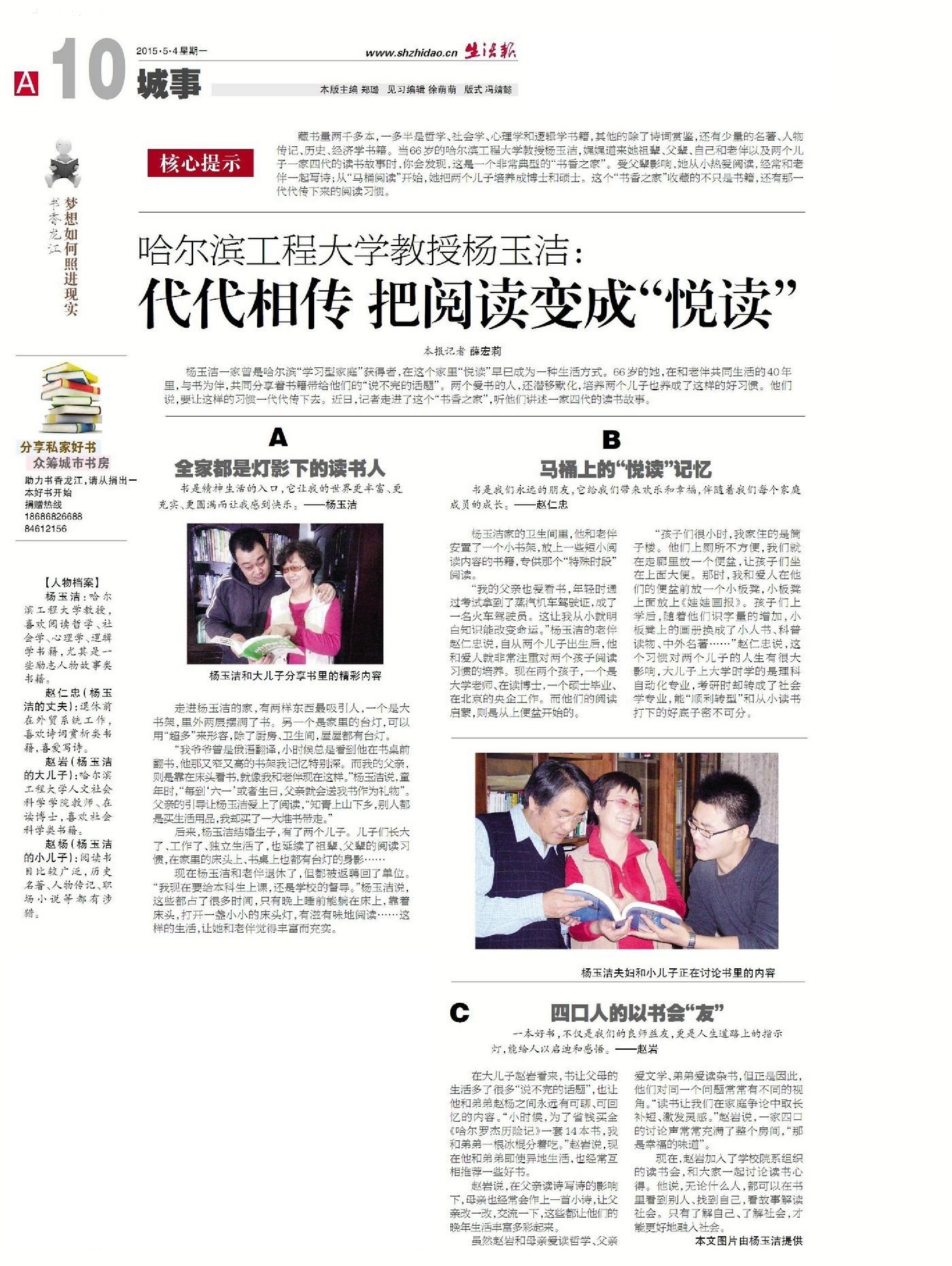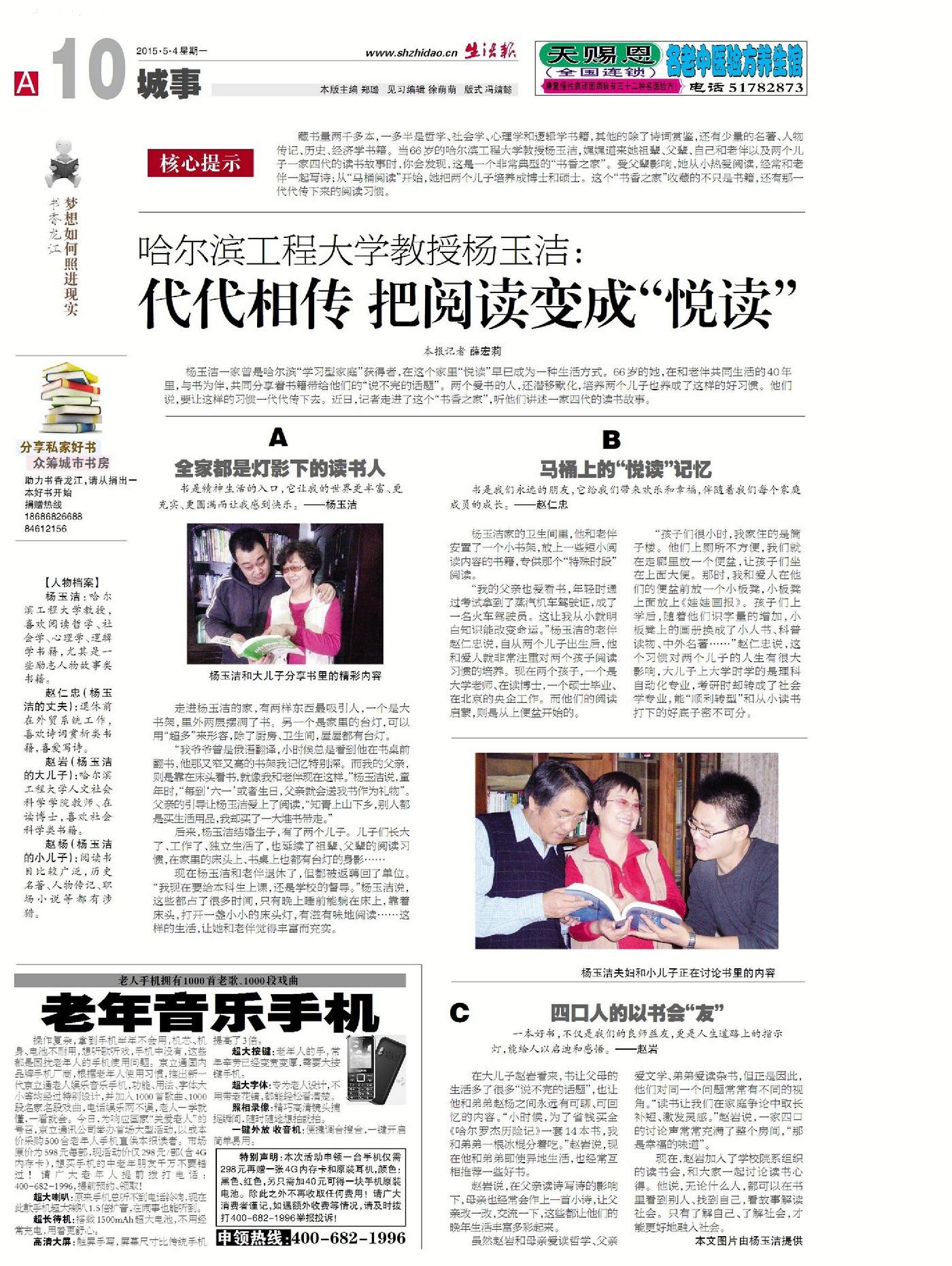 生活报5月4日讯藏书量两千多本,一多半是哲学、社会学、心理学和逻辑学书籍,其他的除了诗词赏鉴,还有少量的名著、人物传记、历史、经济学书籍。当66岁的哈尔滨工程大学教授杨玉洁,娓娓道来她祖辈、父辈、自己和老伴以及两个儿子一家四代的读书故事时,你会发现,这是一个非常典型的"书香之家"。受父辈影响,她从小热爱阅读,经常和老伴一起写诗;从"马桶阅读"开始,她把两个儿子培养成博士和硕士。这个"书香之家"收藏的不只是书籍,还有那一代代传下来的阅读习惯。