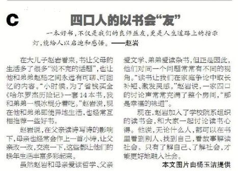 虽然赵岩和母亲爱读哲学、父亲爱文学、弟弟爱读杂书,但正是因此,他们对同一个问题常常有不同的视角。“读书让我们在家庭争论中取长补短、激发灵感。”赵岩说,一家四口的讨论声常常充满了整个房间,“那是幸福的味道”。