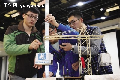 近日,第六届黑龙江省大学生结构设计竞赛在哈尔滨工程大学启航活动中心举行,省内21所高校的138支队伍参加角逐。本届大赛主题为“塔吊模型制作与测试”,参赛人员要用不到100克的竹条制作成塔吊模型,承载起20千克重物,在承重相同的条件下,模型质量最轻者取胜,竞赛主要考验的是材料、力学、结构等方面的知识。本报记者 李巍 摄