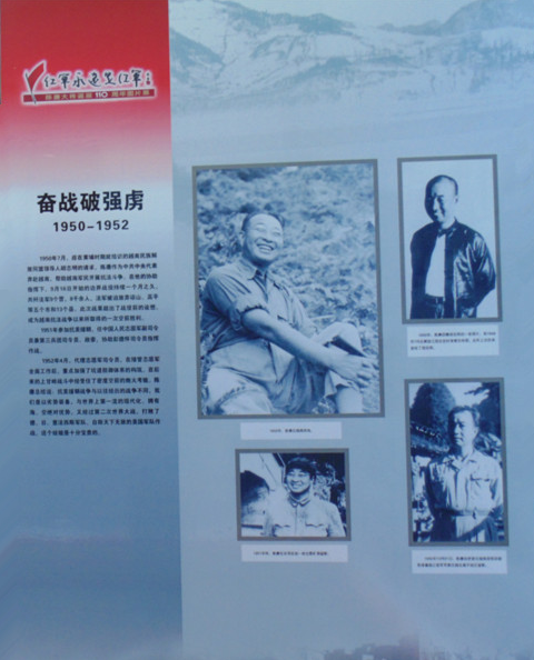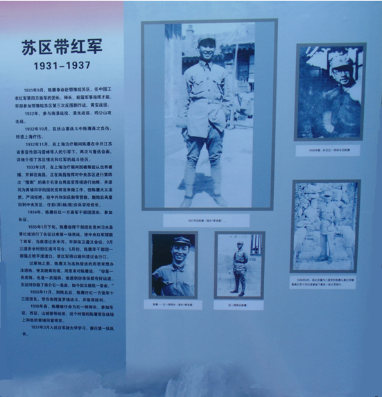 该展主题“红军永远是红军”出自1937年9月红军改编为八路军时的陈赓日记。他在日记中写道:“红军永远是红军……我们始终为了共产党的光荣而奋斗。现在虽然是民族革命的阶段,但一切努力牺牲都是为了将来社会主义的胜利。”陈赓原名陈庶康,生于1903年2月27日,湖南省湘乡县人。1922年加入中国共产党。他是杰出的无产阶级革命家、军事家、教育家,我军功勋卓越的领导人,新中国国防科技和教育事业的初创者。1955年被授予大将军衔,曾担任中国人民解放军副总参谋长兼国防科委副主任、国防部副部长等职。1961年3月16日病逝,享年58岁。