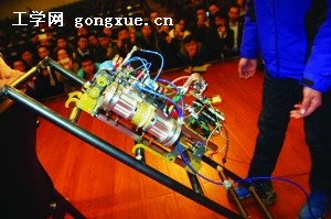 哈工程大学学生在表彰会上演示用于救援、抢险的攀爬机器人