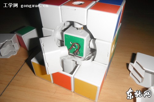目前,市面上最流行的三阶魔方一般由富有弹性的硬塑料制成的正方体,由26个小正方体组成。在六个面上中间部位的小正方体叫做“中心块”,其与中心轴连接在一起,可以顺着轴的方向自由转动。魔方围绕三个中心轴转动,而这三个轴上的六个顶点即“中心块”是静止不动的。苏欣的团队利用这个规律,将音乐播放器的接线口以及控制钮设置在六个“中心块”上,将播放器嵌入了魔方之中。苏欣表示,该作品正在申请专利中。