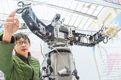 1日,第二届全国TRIZ杯大学生创新方法大赛在哈尔滨工程大学举行,共有14个省市自治区47所高校500多个代表队参赛,提交作品434件。作品的实用性强,目前已有9件参赛作品和企业对接成功。TRIZ意译为发明问题的解决理论。图为比赛现场,大学生展示的可自动摘柿子的机器人。