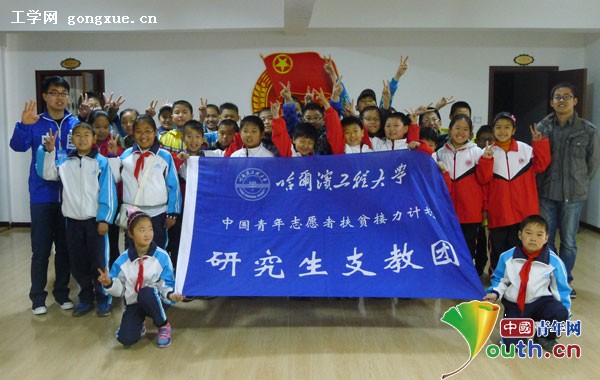 哈尔滨工程大学研究生支教团成员与孩子们在一起