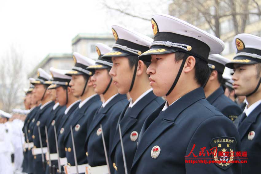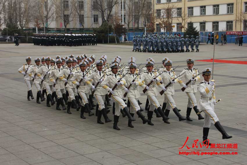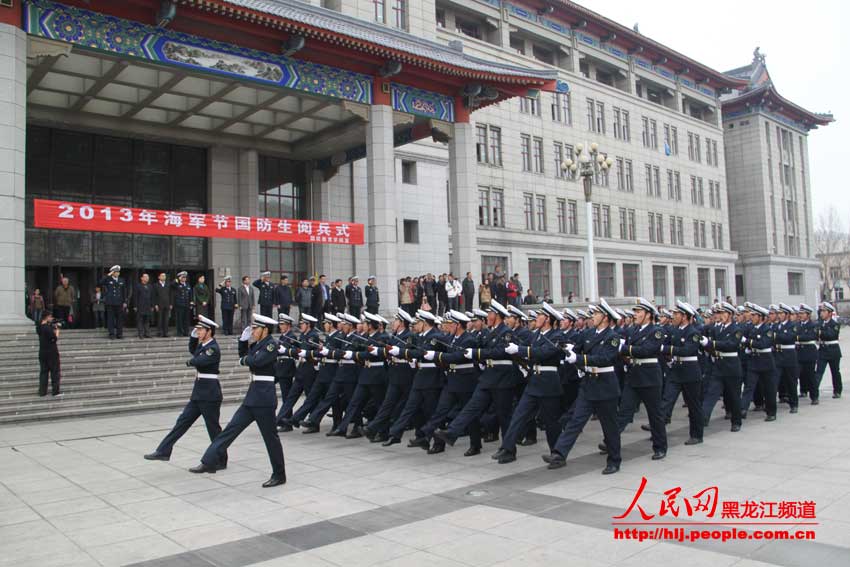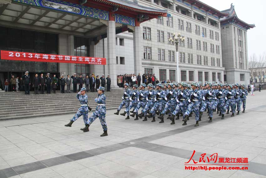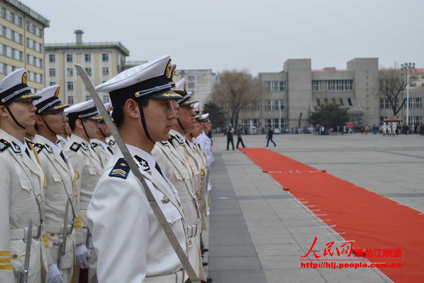 4月23日中午,全体哈尔滨工程大学海军国防生在学校奥利霍夫广场列队,三百余名国防生组成的国旗护卫队、徒手、劈枪、持枪四个方队接受校领导的检阅。随后的分列式,四个方队伴随着雄壮的音乐依次走过阅兵台,国防生整齐的步伐、挺拔的身姿,充分展现了新一代海军后备军官的风采。