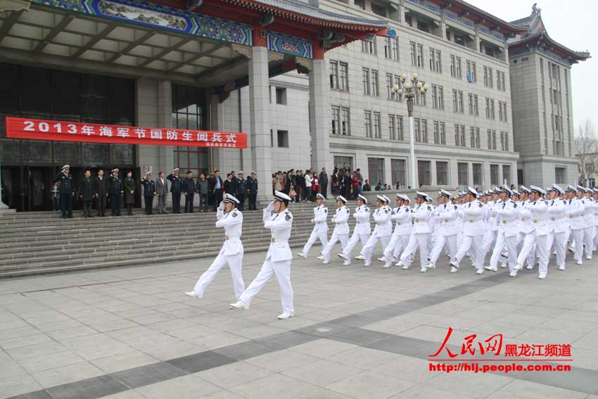 人民网哈尔滨4月23日电(实习记者杨海全)4月23日,哈尔滨工程大学全体海军国防生举行了阅兵仪式,纪念中国人民解放军海军建军64周年。这一活动的开展也将哈尔滨工程大学第五届海军节文化建设月系列活推向了又一高潮。