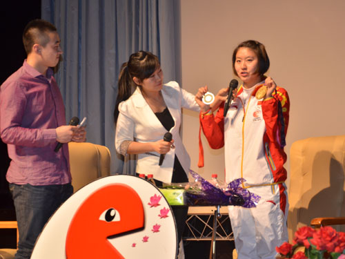 焦刘洋在访谈中坦诚实在地与同龄人进行了近距离的交流。她时而坚定自信,时而可爱稚气,让人看到了叱咤赛场的奥运冠军的另一面。最后,焦刘洋又一次和哈工程师生约定:2016年奥运会如果再次夺金,她还会回到这个给她带来好运气的校园。