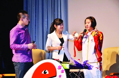 焦刘洋展示奥运奖牌 昨日做客哈工程大学阳光论坛