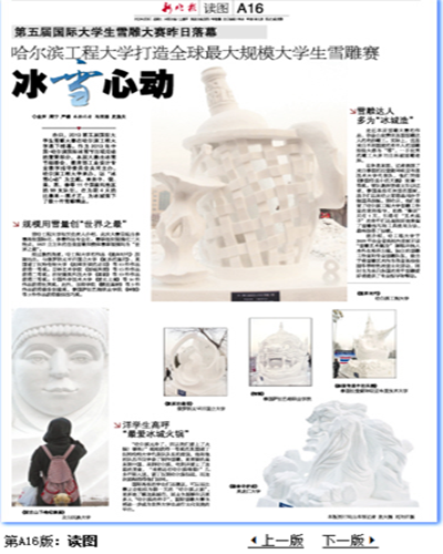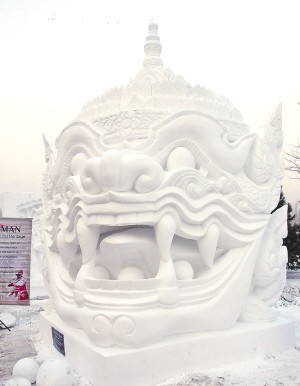 昨日,2013第五届国际大学生雪雕大赛在哈尔滨工程大学落下帷幕。作为2013年中国·哈尔滨国际冰雪节百项活动的重要部分,本届大赛由冰雪节组委会、教育部工业设计专业教学指导委员会共同主办,哈尔滨工程大学承办,以“冰雪心动”为主题。来自中、俄、美、英、泰等11个国家和地区的58支队伍,在为期4天的比赛里一展才艺,为冰城留下了数十件雪雕精品。