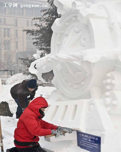 1月7日,北华大学参赛选手在雕刻雪雕《魔幻火车》。新华社记者王松摄