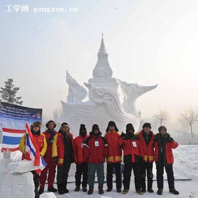 1月7日,泰国拉查蒙坤坦亚布里技术大学参赛选手在雪雕作品《泰国传说中的天鹅》前合影。新华社记者王松摄