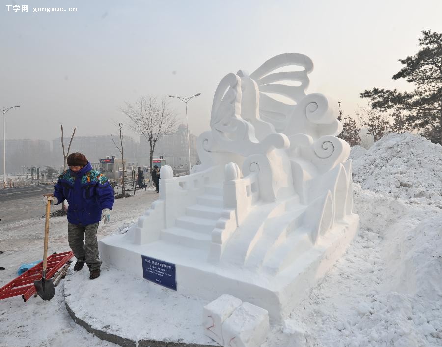 这是昆明学院雪雕作品《蝶恋莲桥》(1月7日摄)。新华社记者王松摄